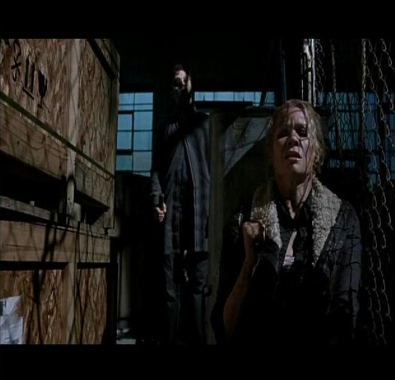 Above we see Andrea, armed with what seems to be a knife, and The Governor armed with a blunt object, possibly a baton.It looks like they're in a back part of the arena, judging from the windows and crates. This scene will have us biting our nails, hoping for Andrea to fight or escape from Philip. |